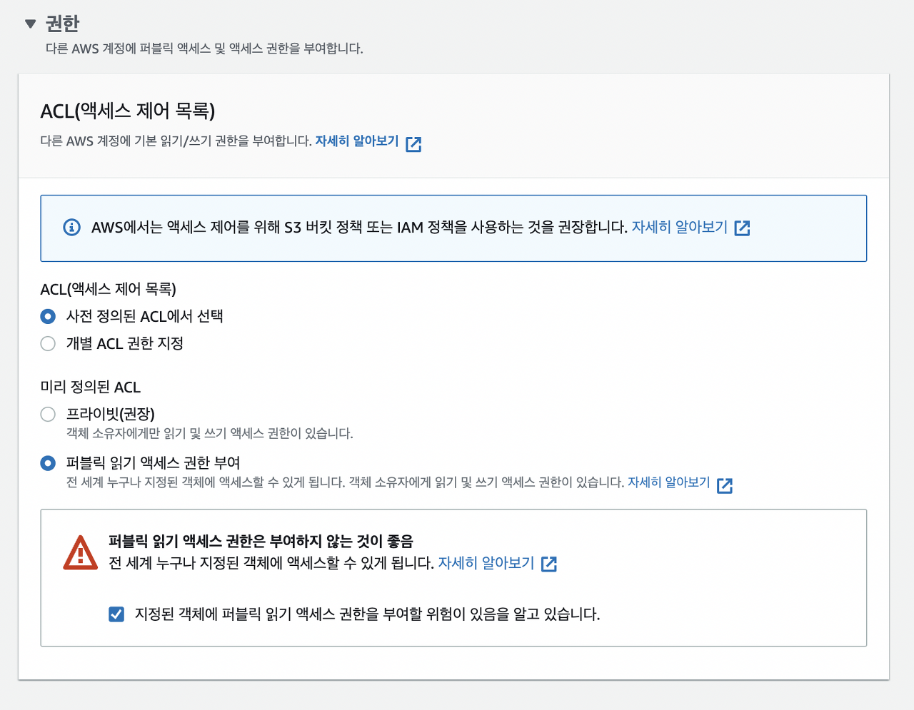 제일 하단의 [미리 정의된 ACL - 퍼블릭 읽기 액세스 권한 부여]를 클릭한다.