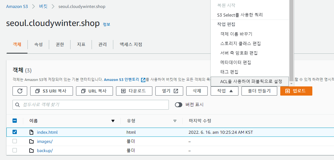 다시 S3로 가서 - 이미지 내 이미지와 index.html에 권한을 퍼블릭으로 준다.(이걸 하지 않으면 403 forbidden이 뜬다.)