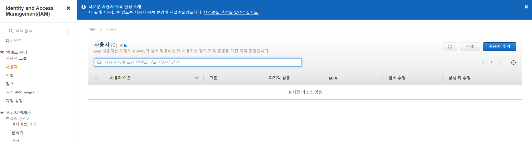 IAM에 들어가서 - 사용자 메뉴 - [사용자 추가] 들어간다.