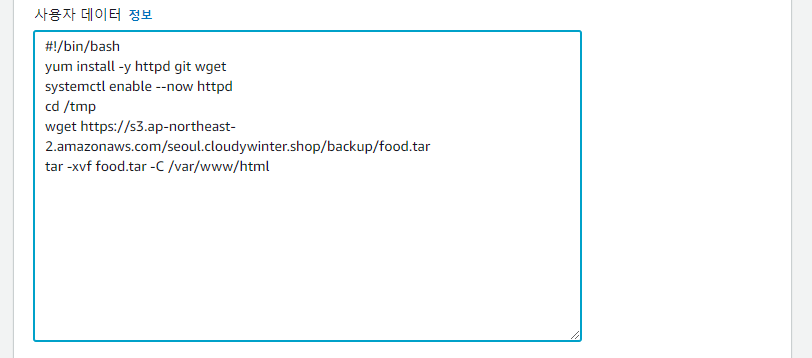 아까 S3의 backup에 올린 food.tar파일을 이용하여 홈페이지를 꾸며본다.