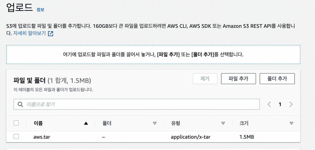 도메인 버킷에 aws.tar파일을 업로드한다.
