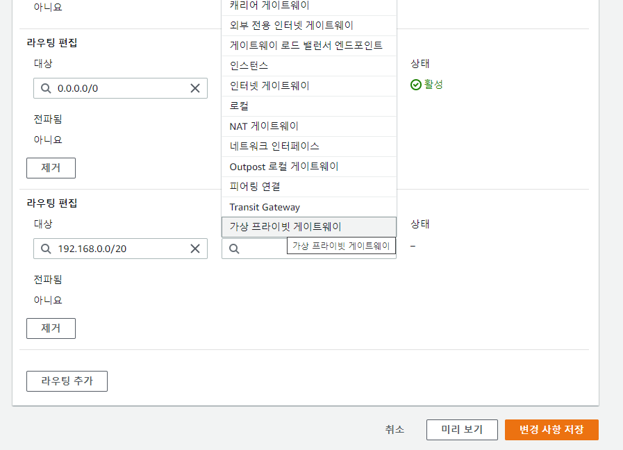 가상 프라이빗 게이트웨이를 대상으로 라우팅 편집을 진행한다.