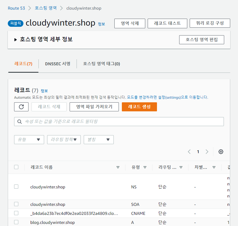 Route 53 - [호스팅 영역] 메뉴 > 내 도메인 클릭