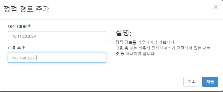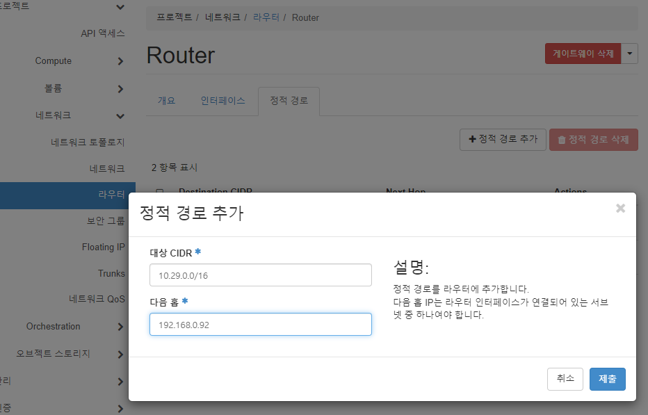 next hop : Openstack의 IP(현재 링크)를 입력한다.