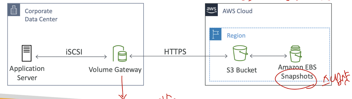 - Stored volumes : 전체 데이터셋이 온프래미스에 있으며, S3에 백업이 예약된다.