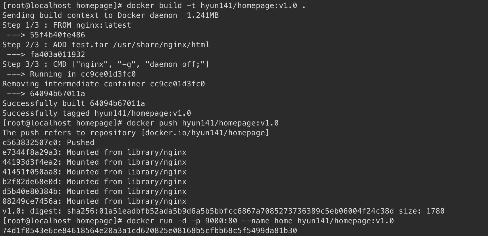 docker run -d -p 9000:80 --name home hyun141/homepage:v1.0