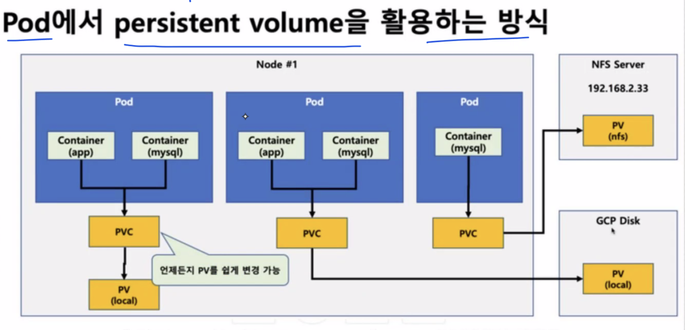 pod가 사라지더라도 그 volume이 손실되지 않도록 한다. AWS의 EC2와 EBS간의 관계와 비슷하다.