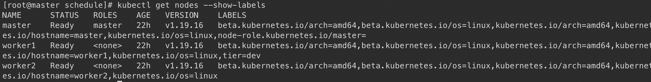 worker1 Ready <none> 23h v1.19.16 beta.kubernetes.io/arch=amd64,beta.kubernetes.io/os=linux,kubernetes.io/arch=amd64,kubernetes.io/hostname=worker1,kubernetes.io/os=linux,tier=dev